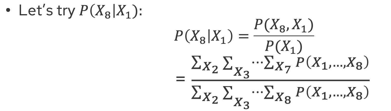 $ P(X_i \mid D) = \frac{\sum_{X_1, \dots, X_n} P(X_1, \dots, X_n, D)}{P(D)} $