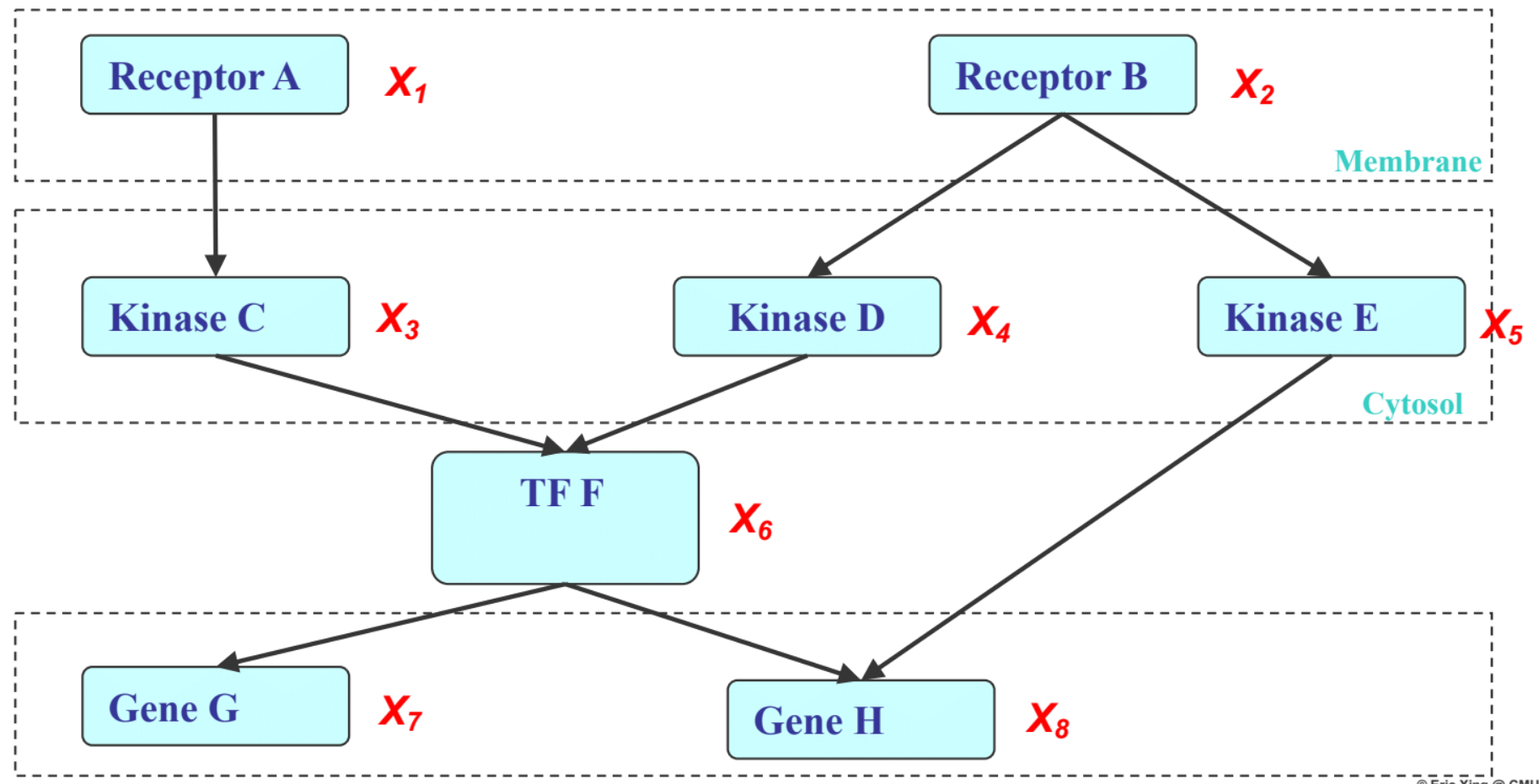 Example of how imposing a dependency structure simplifies representation of a PGM of the inside of a cell: