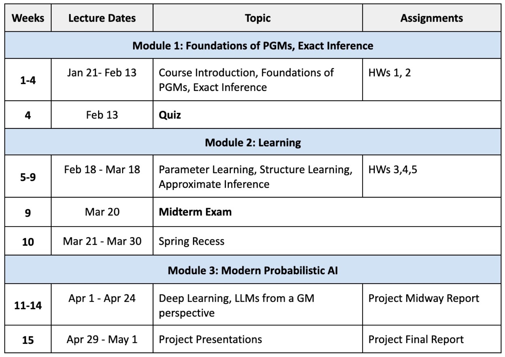 - Midway Report (5%): Due Apr 11, 2025. Build on the proposal to have some preliminary dataset exploration and revised methods.